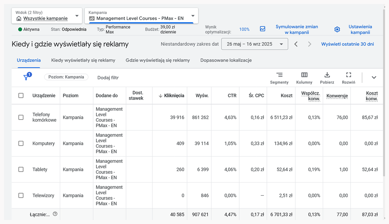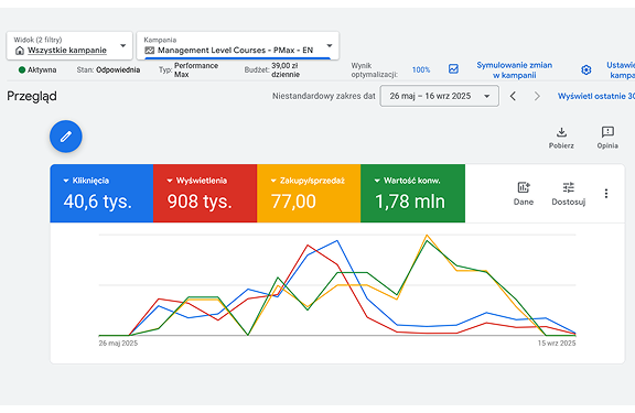 Kampania została zrealizowana w modelu Performance Max, aby maksymalnie wykorzystać algorytmy Google do dotarcia do osób faktycznie zainteresowanych tematyką kursów.